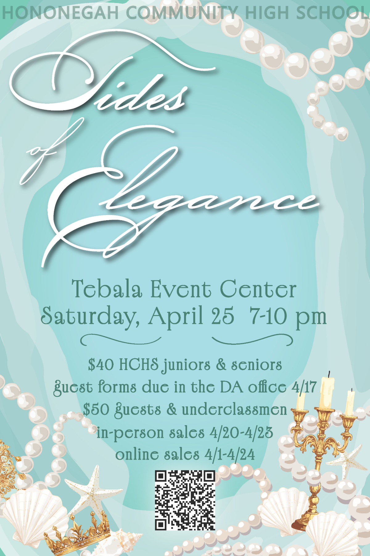 Your Junior class is happy to announce that our Tides of Elegance themed Prom will be held on April 25th at Tebala Events Center. The dance will be from 7-10 pm with doors opening at 7:00. We will be selling tickets before and after school April 20th-23rd. Ticket prices for Hononegah Juniors and Seniors is $40, guest tickets and underclassmen guests are $50. Tickets may also be purchased online using the QR code found on the posters around the school. Guest forms can be turned into the DA office and are due by April 17th.